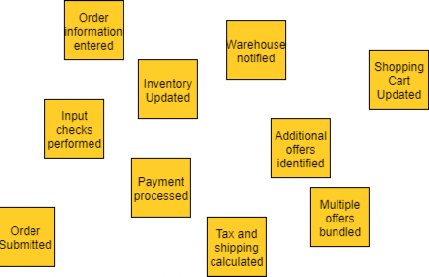 接下来的步骤通过将事件按顺序(通常从左到右)来帮助识别任何可能缺失的事件。订单建立后,您可以向后转移以帮助识别其他事件。在我们的电商例子中,首先输入订单信息,然后输入正在检查的库存。在把它们放在一起时,我们发现我们为正在执行的输入检查留下了一个事件。